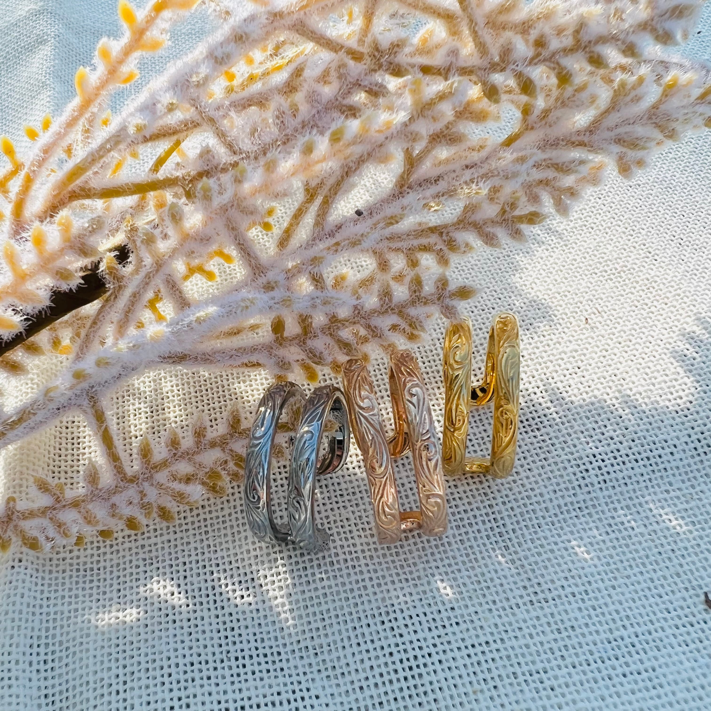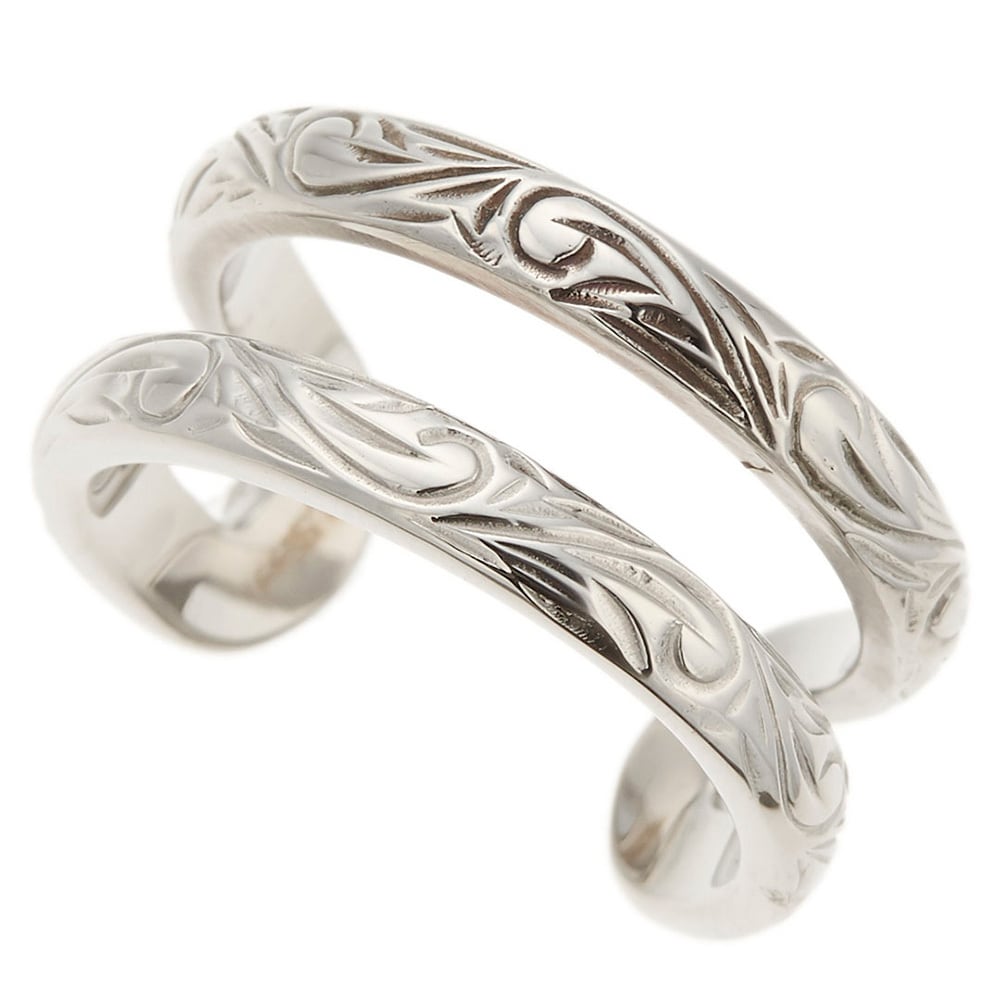 丸甲リングに手掘りでスクロール柄を丁寧に入れました。隙間を開けた2連風デザインでぬけ感がありつつ上品な存在感のデザイン。