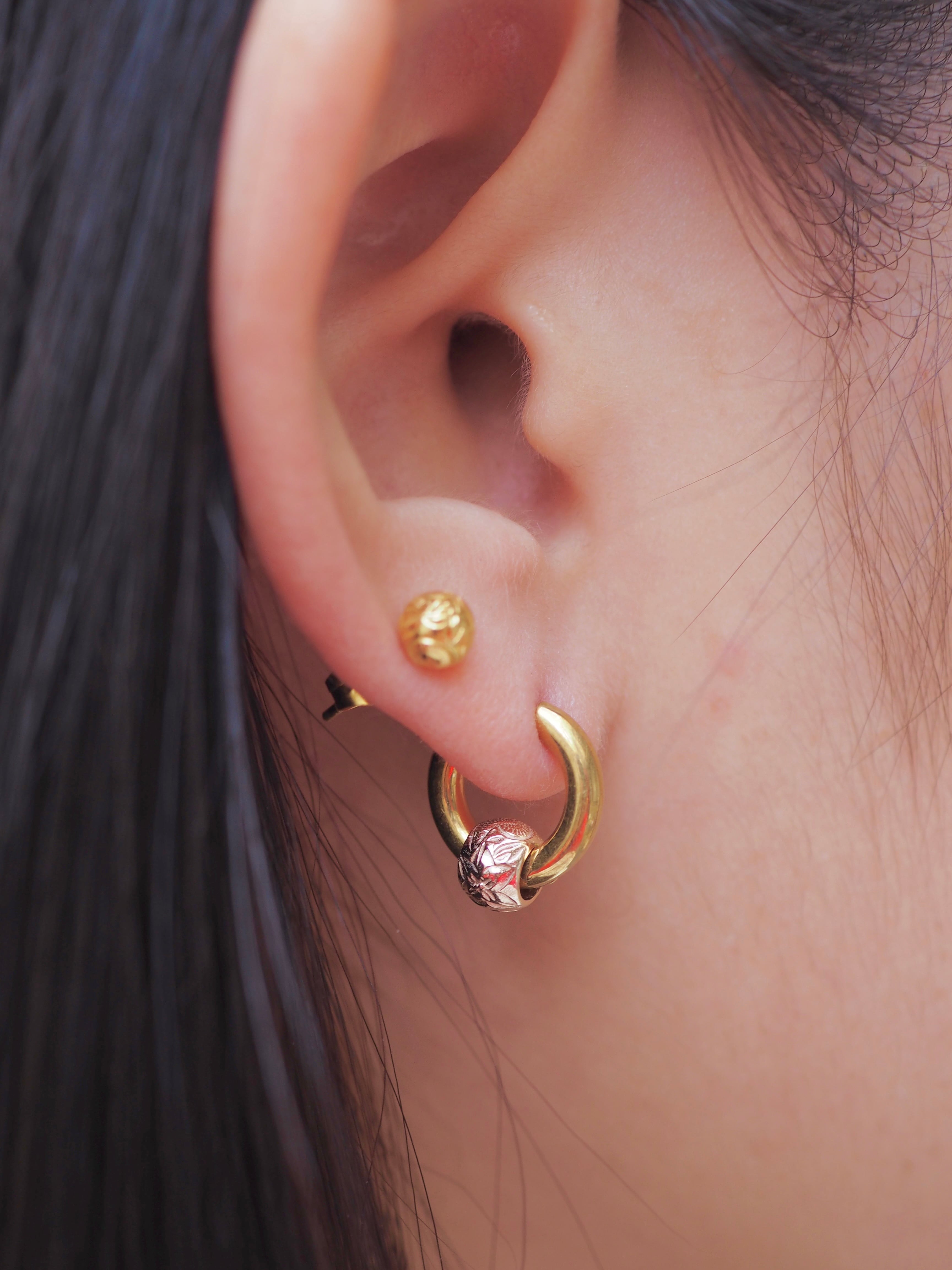 ハワイのモアナ(大海)をイメージした彫りスクロール(波)とプルメリアの彫り模様が施された、細部に至るまでこだわりが詰まったデザイン。小ぶりながらも存在感があるハワイアンビーズが特徴的なワンタッチ式リングピアスです。